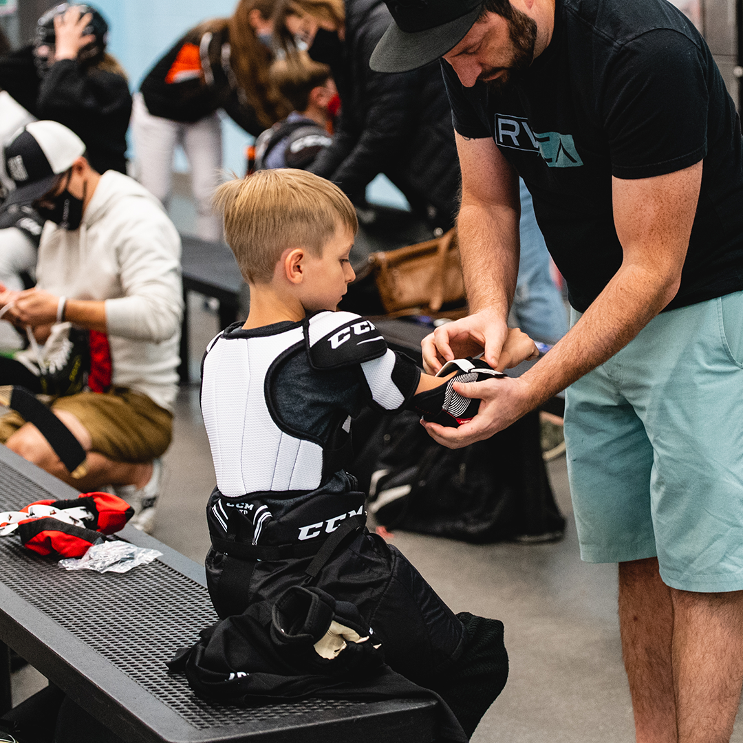 - Full set of hockey equipment to keep, including: helmet, gloves, neck guard, jersey, shoulder pads, elbow pads, hockey pants, hockey socks, shin guards, skates, stick (straight blade), and an equipment bag.